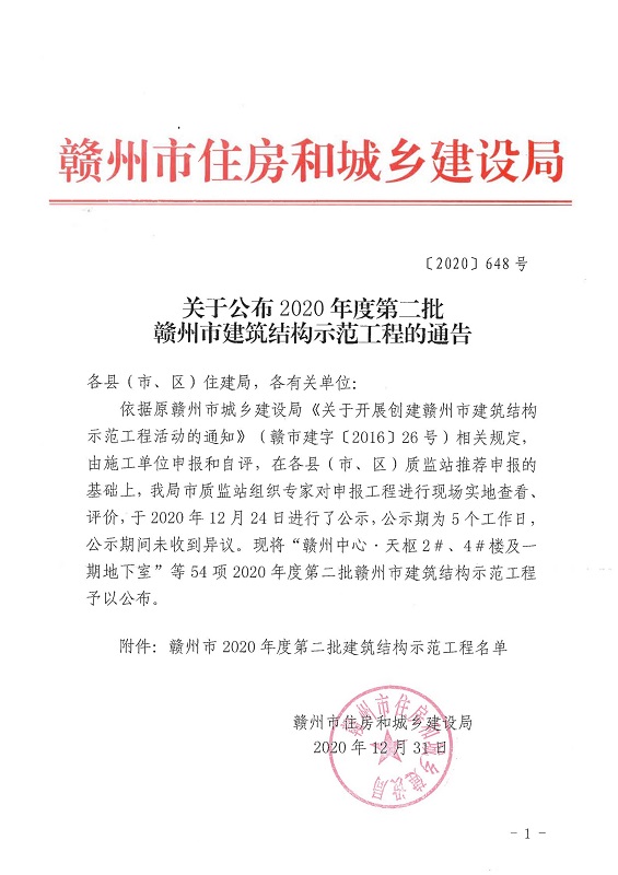 近日,赣州市住房和城乡建设局发布《关于公布2020年度第二批赣州市建筑结构示范工程的通告》,赣州市国投集团下属赣州粮食城在建项目综合楼喜获殊荣。