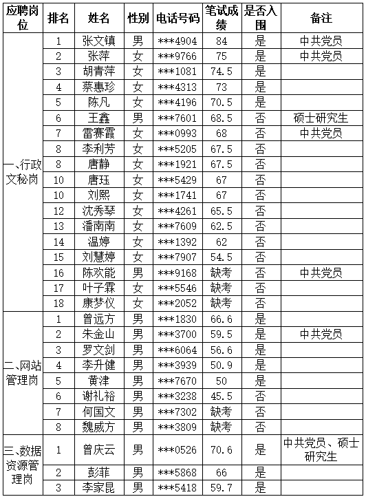 根据《赣州市国有资产投资集团有限公司招聘公告》,经网上报名、资格预审、笔试等程序确定赣州市大数据发展有限公司岗位入围面试人员,现予公示。