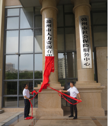 在全体成员的见证下,伴随着热烈的掌声,赣州市国投集团党委副书记、总经理谢忠祥与赣州市人力资源和社会保障局党组成员、副局长黄锋章共同为赣州市人力资源有限公司揭牌。