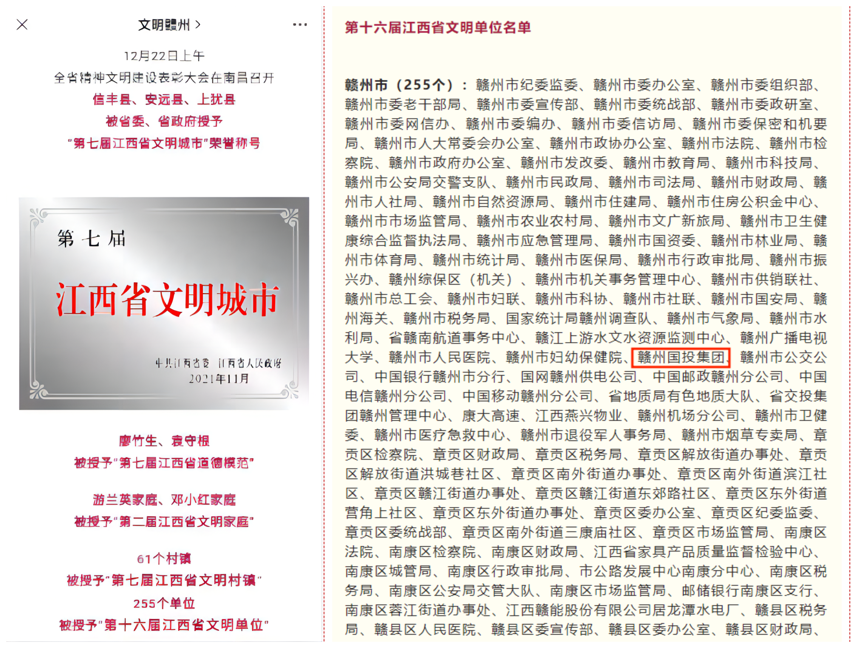 12月22日上午,全省精神文明建设表彰大会在南昌召开,255个单位被授予“第十六届江西省文明单位”,赣州市国投集团榜上有名。