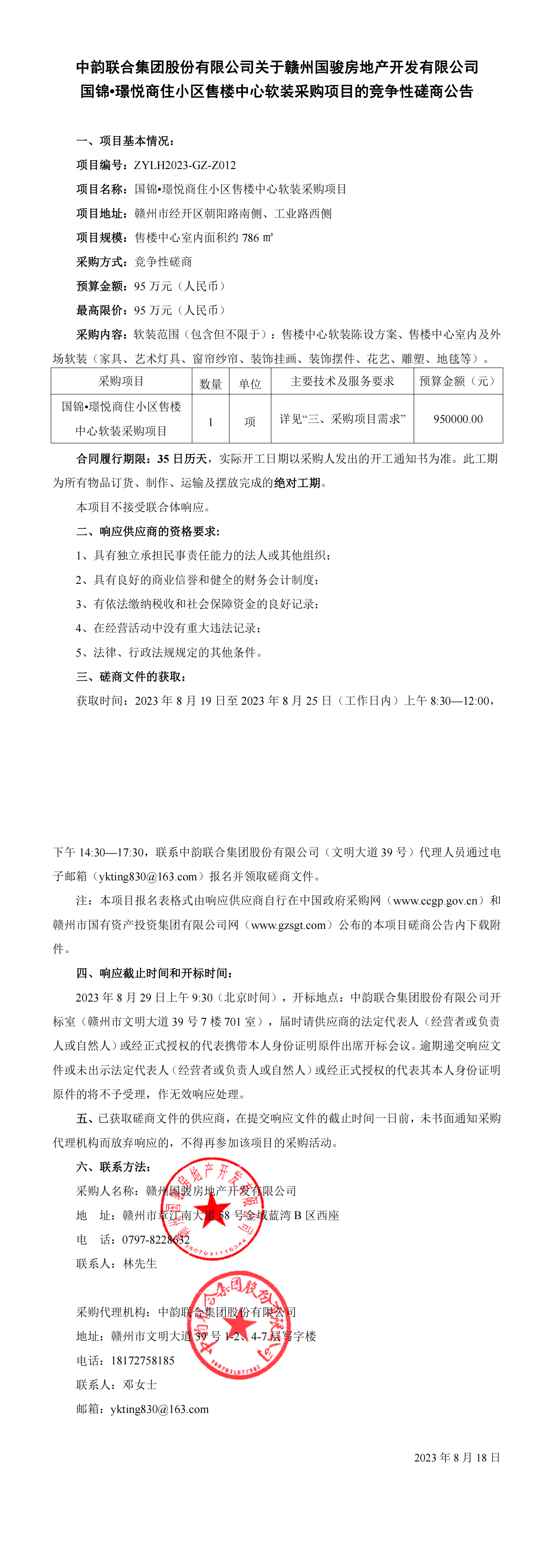 中韵联合集团股份有限公司关于赣州国骏房地产开发有限公司国锦•璟悦商住小区售楼中心软装采购项目的竞争性磋商公告