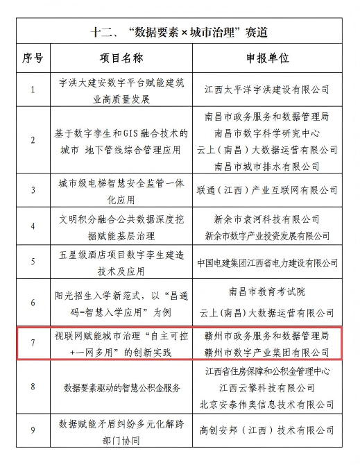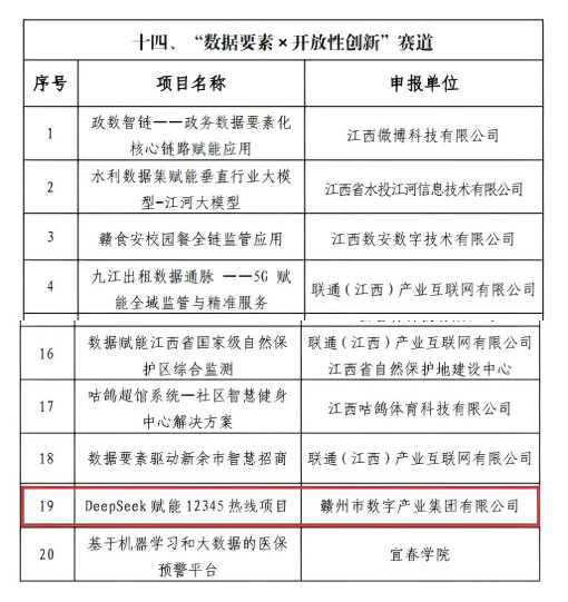 近日,2025年“数据要素×”大赛江西分赛决赛入围名单公示。赣州市国投集团下属市数字产业集团选送的视联网赋能城市治理“自主可控+一网多用”的创新实践、生态环境数据重构“环责险”价值体系、DeepSeek赋能12345热线项目共3个项目分别在“数据要素×城市治理”、“数据要素×绿色低碳”和“数据要素×开放性创新”赛道脱颖而出,顺利晋级决赛。这标志着赣州市数字产业集团在数据要素价值挖掘与应用创新方面取得重要进展,专业能力与行业贡献获得赛事权威认可。