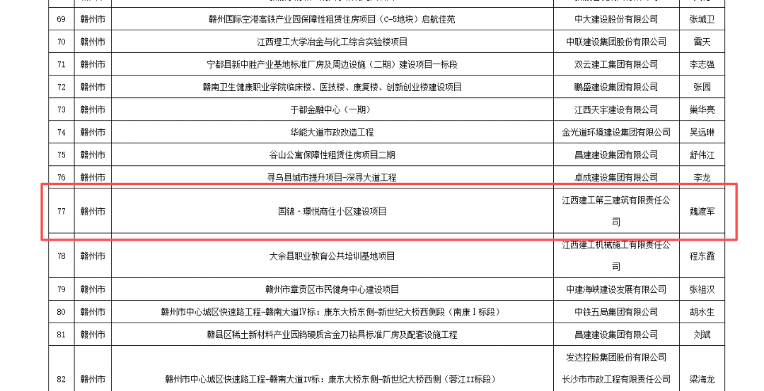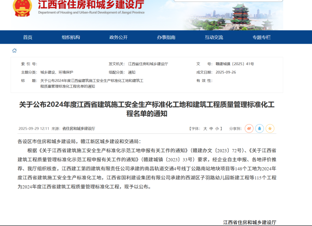 近日,江西省住房和城乡建设厅正式印发《关于公布2024年度江西省建筑施工安全生产标准化工地和建筑工程质量管理标准化工程名单的通知》。由集团下属子公司国锦公司开发建设的“国锦·璟悦”项目,凭借其在安全生产、文明施工、质量管控及标准化管理等方面的卓越表现,成功入选2024年度“江西省建筑施工安全生产标准化工地”称号。这一省级重磅荣誉,是对项目安全管理水平与工程建设品质的权威认可。