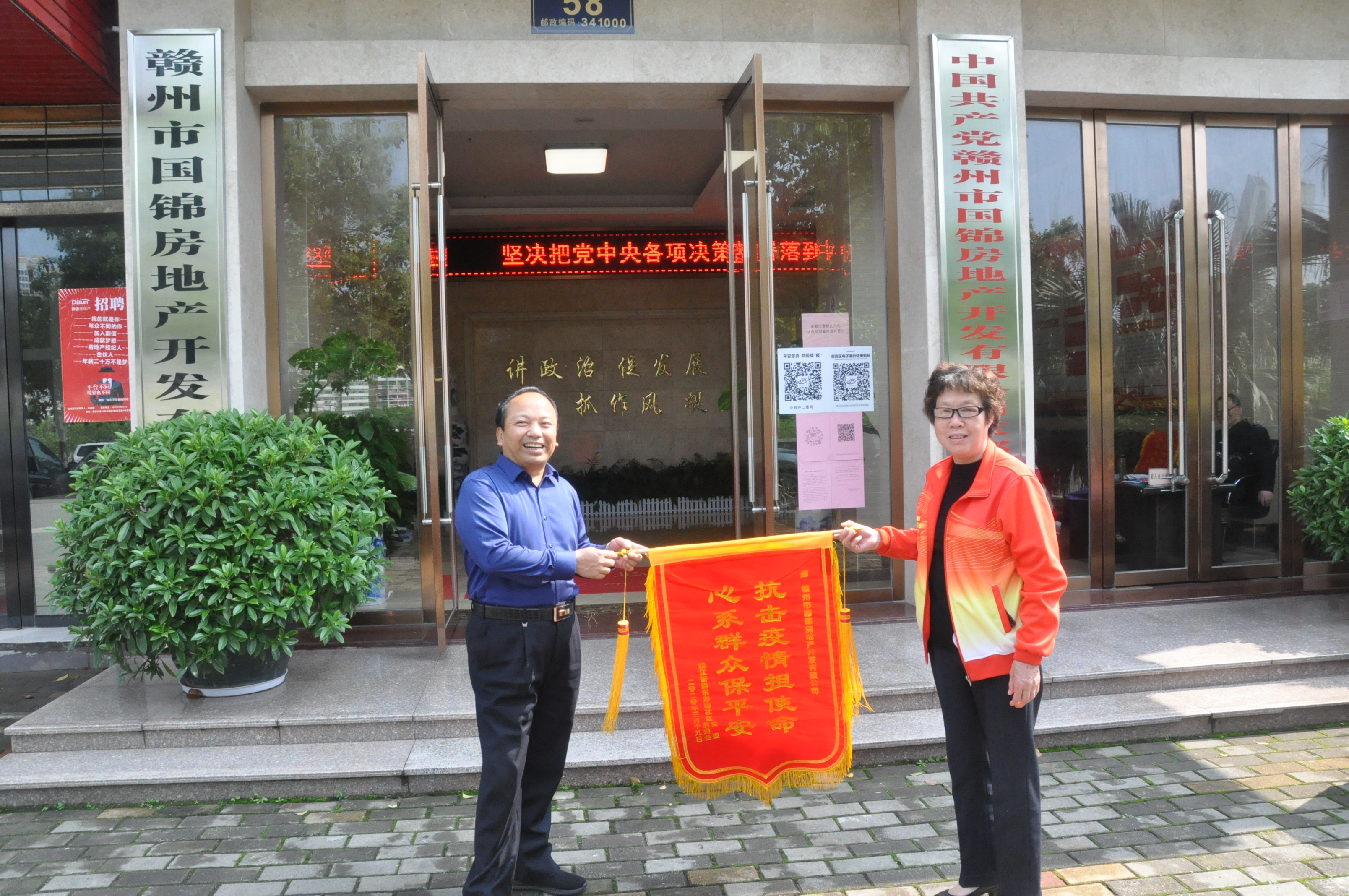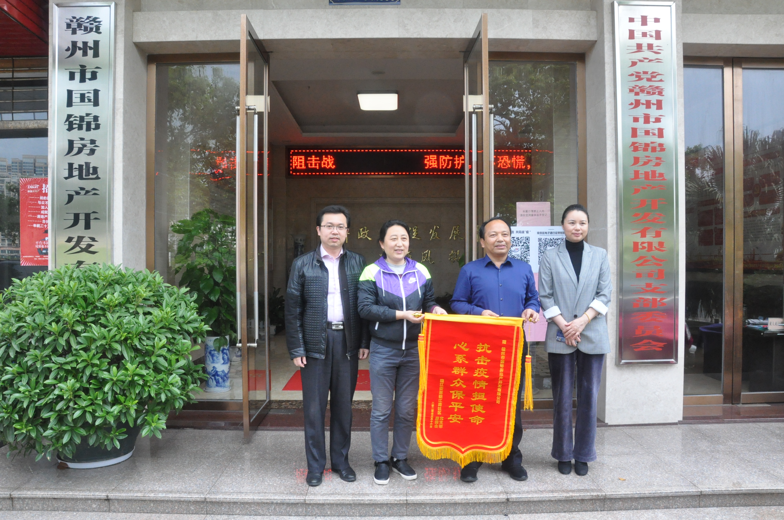 3月26日下午,章贡区赣江街道东郊路社区居委会党委、赣江路社区居委会党支部分别将鲜红的锦旗送到了赣州市国投集团国锦房地产开发公司,以感谢公司积极协助社区做好疫情防控工作。