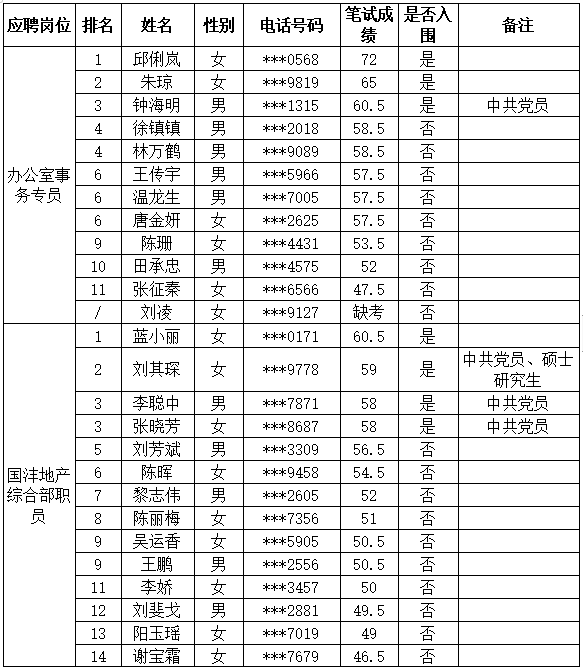 赣州市国有资产投资集团有限公司公开招聘办公室事务专员、国沣地产综合部职员岗位入围面试人员公示