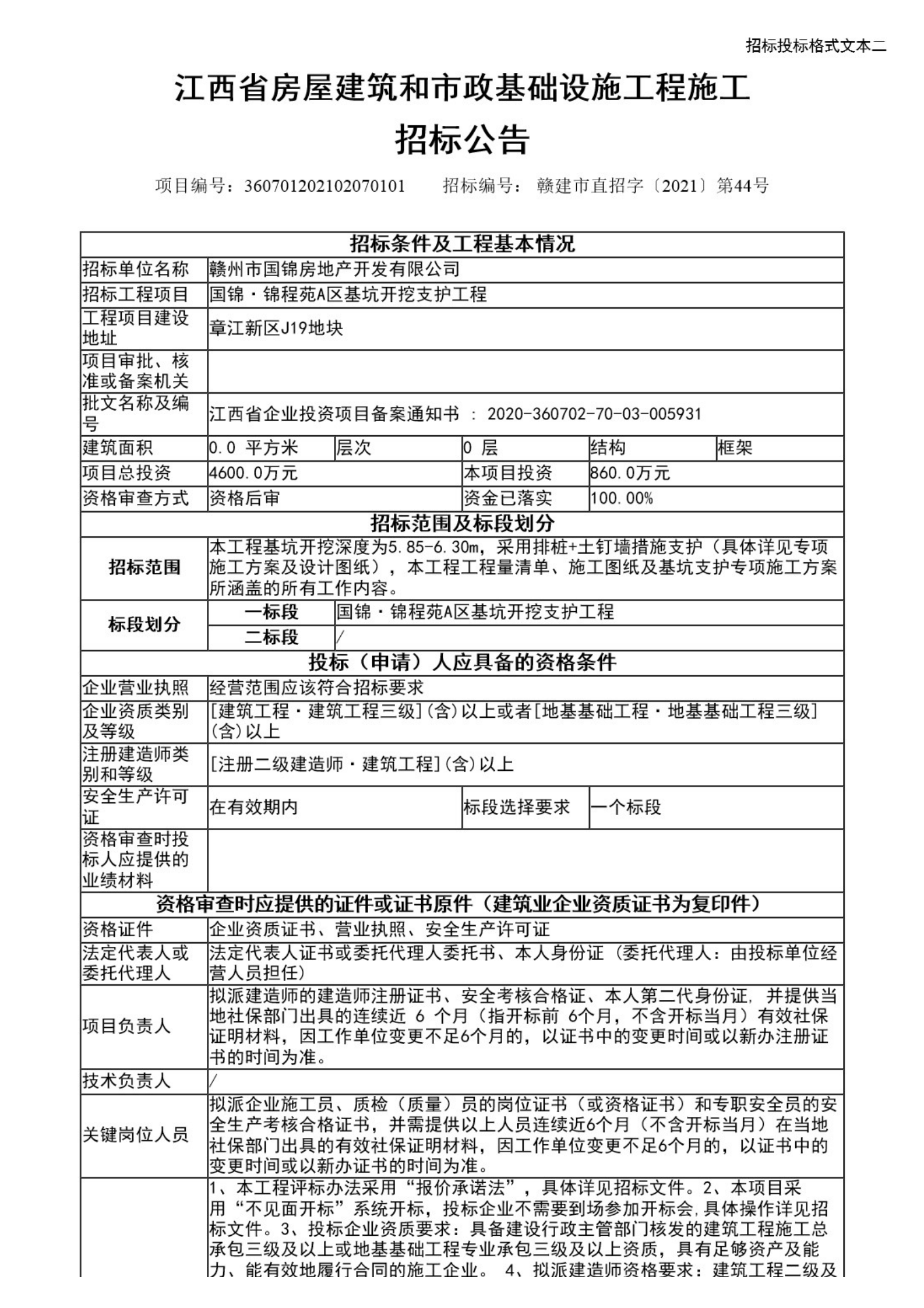 首页 新闻动态 国锦·锦程苑A区基坑开挖支护工程招标公告