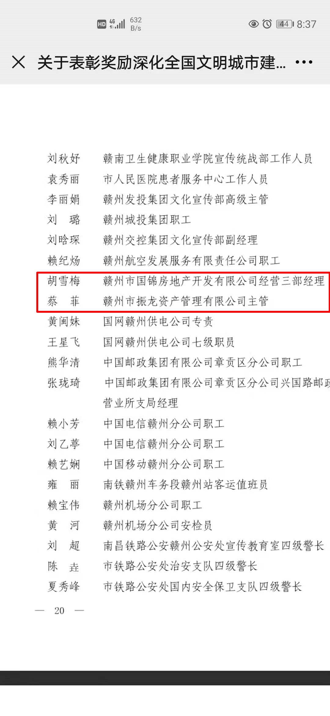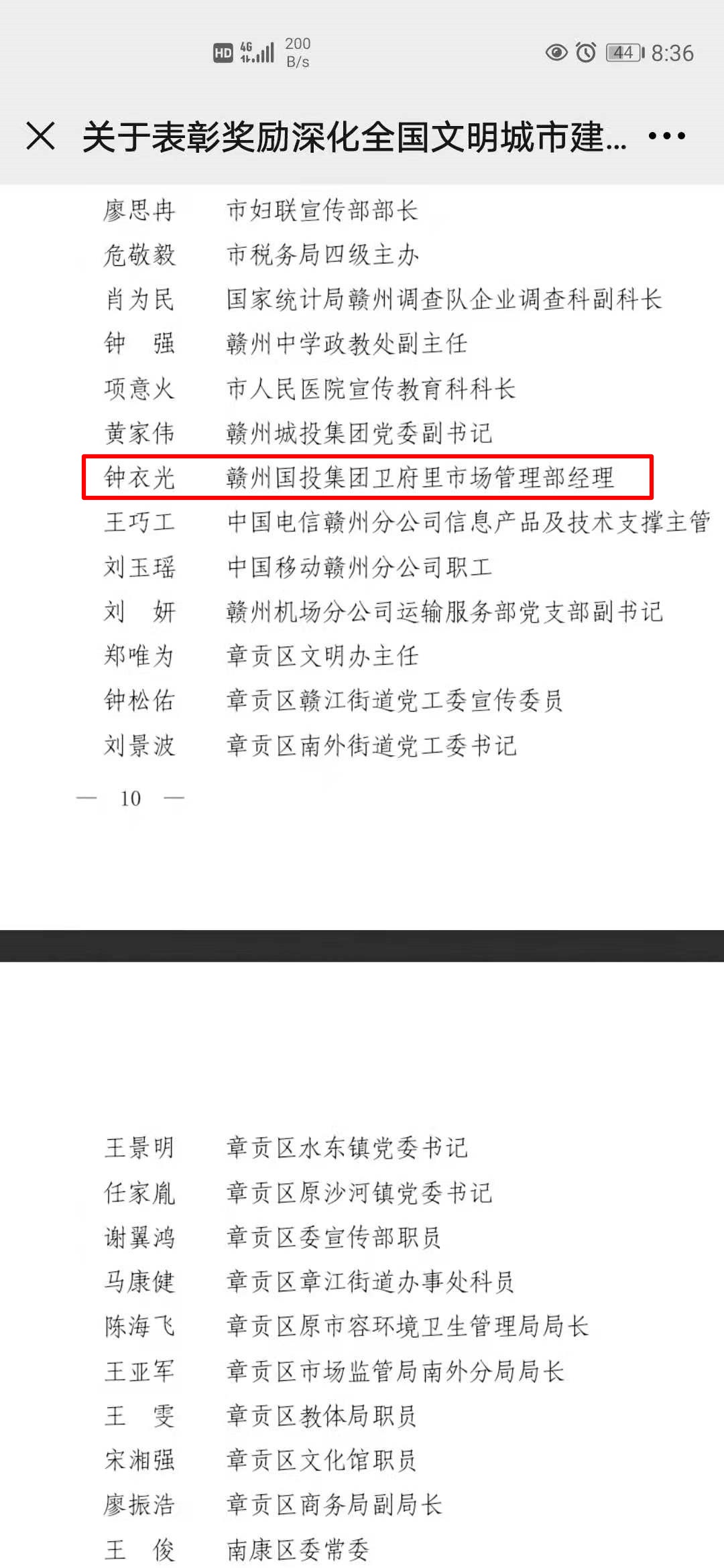 近日,中共赣州市委、赣州市人民政府发文表彰深化全国文明城市建设工作先进集体和先进个人,集团一批人员表现突出喜获表彰,钟衣光荣获深化全国文明城市建设工作先进个人,胡雪梅、蔡菲荣获深化全国文明城市建设工作优秀志愿者。