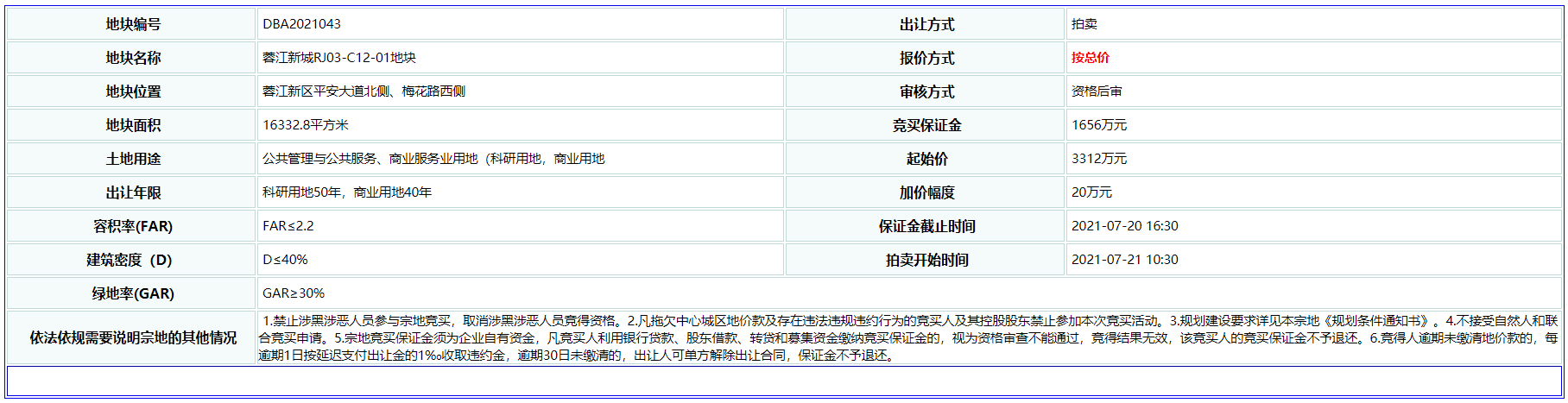 地块编号DBA2021043,位于蓉江新区平安大道北侧、梅花路西侧。出让面积为16332.8平方米;土地性质为公共管理与公共服务、商业服务业用地(科研用地,商业用地);出让年限为科研用地50年,商业用地40年;容积率:FAR≤2.2;建筑密度:D≤40%;绿地率:GAR≥30%。