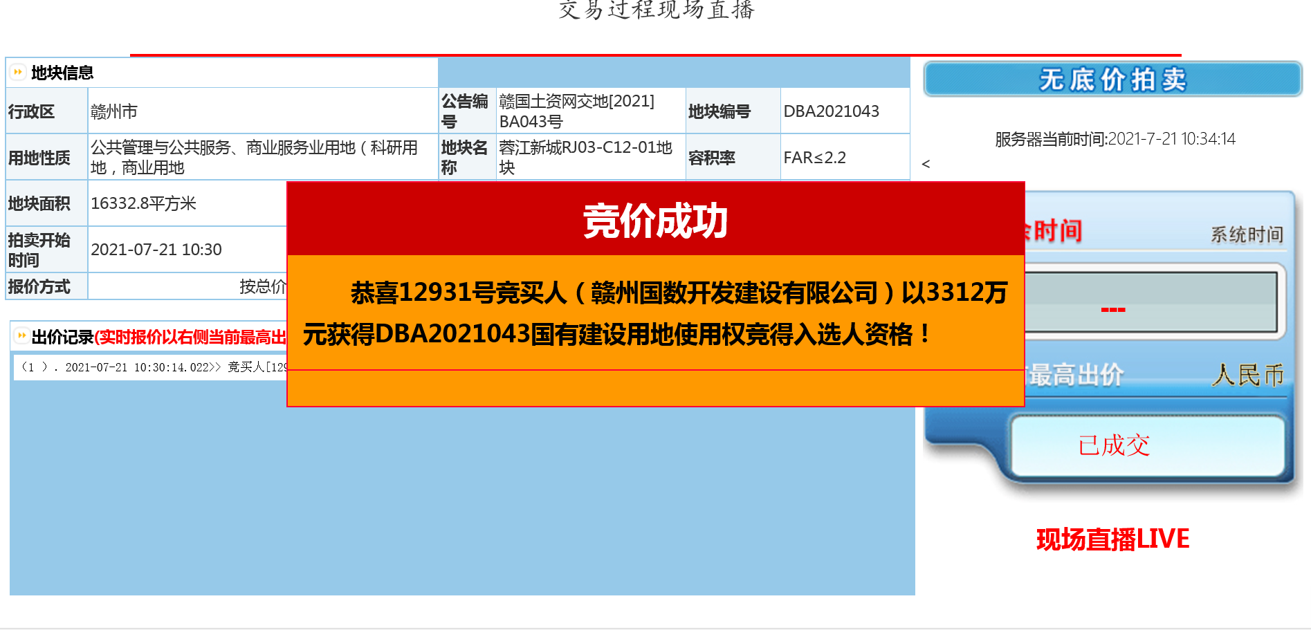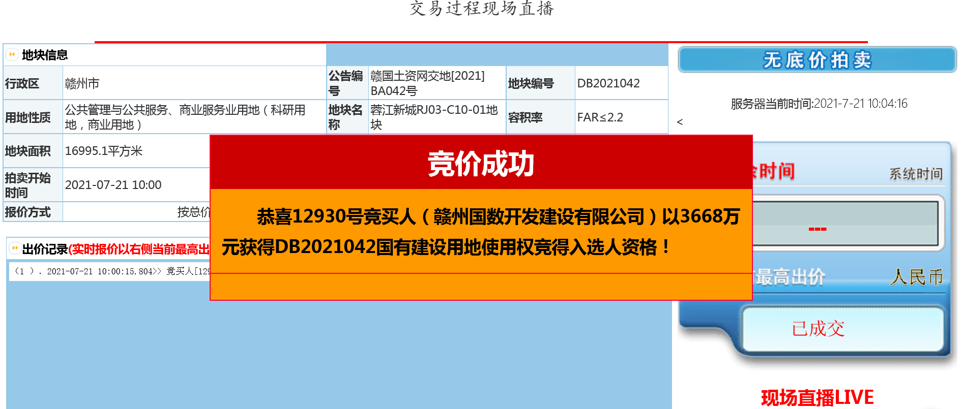 7月21日上午,赣州国数开发建设有限公司再次成功竞得蓉江新区2宗国有建设用地。