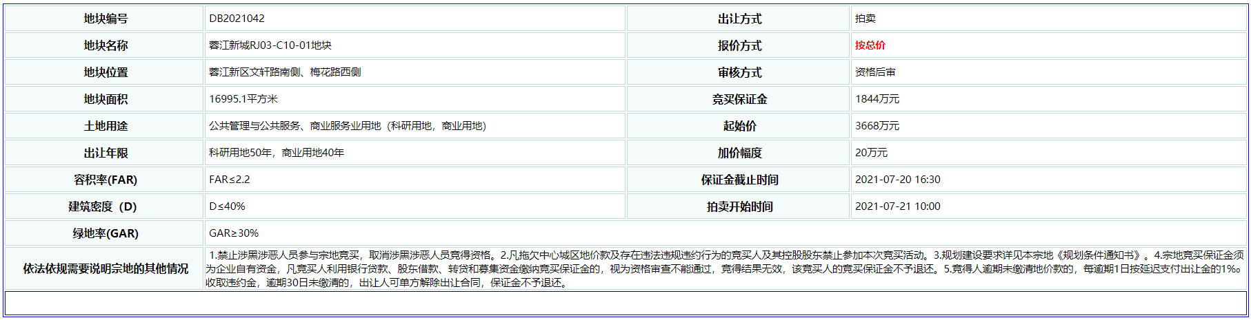 地块编号DB2021042,位于蓉江新区文轩路南侧、梅花路西侧。出让面积为16995.1平方米;土地性质为公共管理与公共服务、商业服务业用地(科研用地,商业用地);出让年限为科研用地50年,商业用地40年;容积率:FAR≤2.2;建筑密度:D≤40%;绿地率:GAR≥30%。