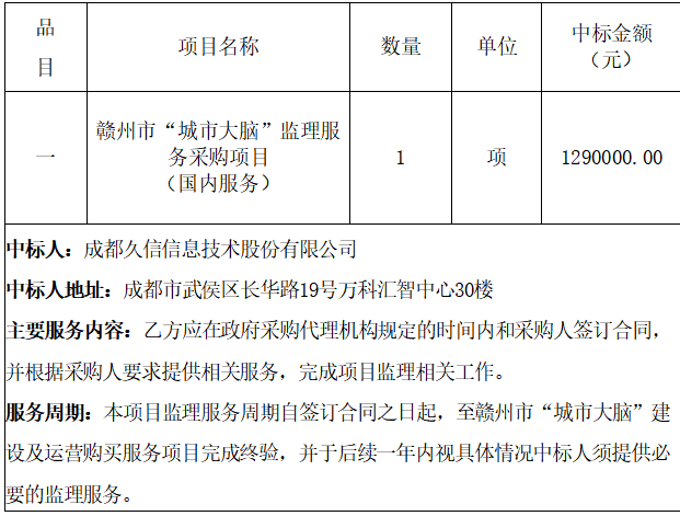 赣州市“城市大脑”监理服务采购项目公开招标的中标结果公告