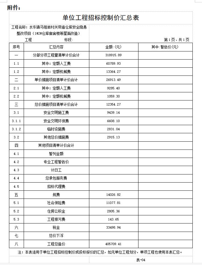 一 | 水东镇马祖岩村关帝庙仓库安全隐患整改项目(国内工程) | 1 | 项 | 405709.41 | 详见附件 |
