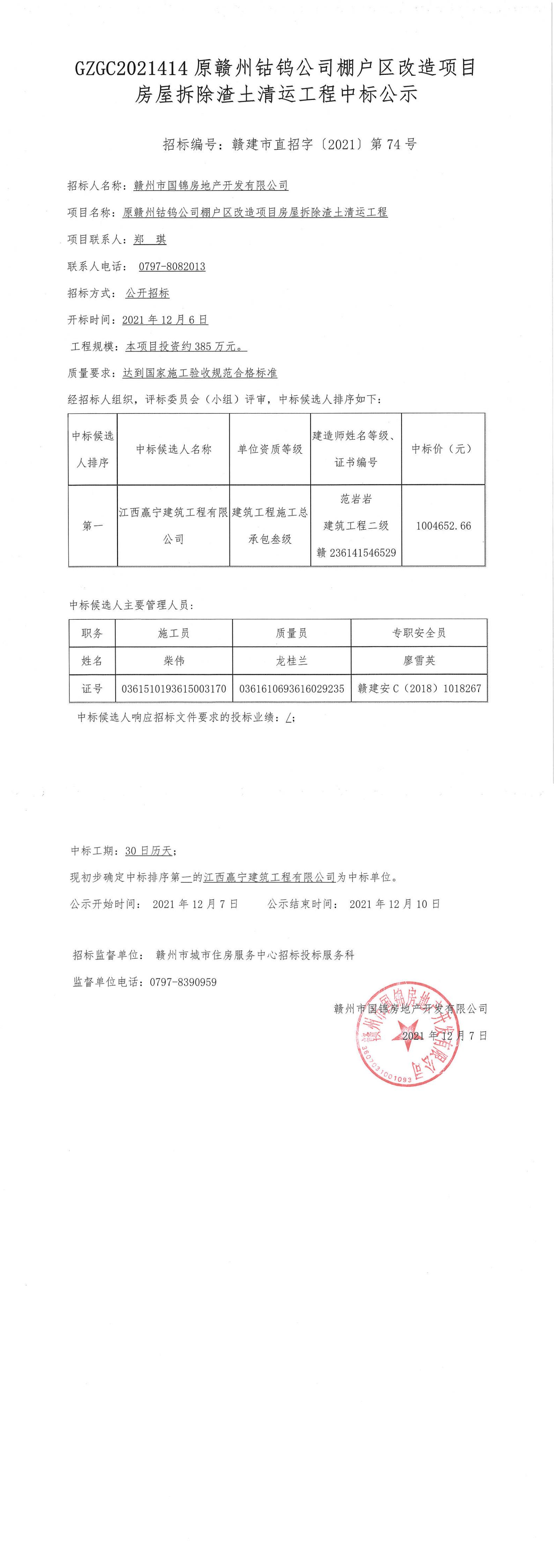 首页 新闻动态 原赣州钴钨公司棚户区改造项目房屋拆除渣土清运工程中标公示