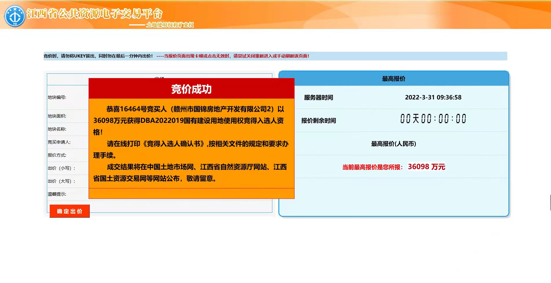 3月31日上午,赣州市国投集团下属国锦房地产公司以总价36098万元成功竞得西城区M-11-02地块。