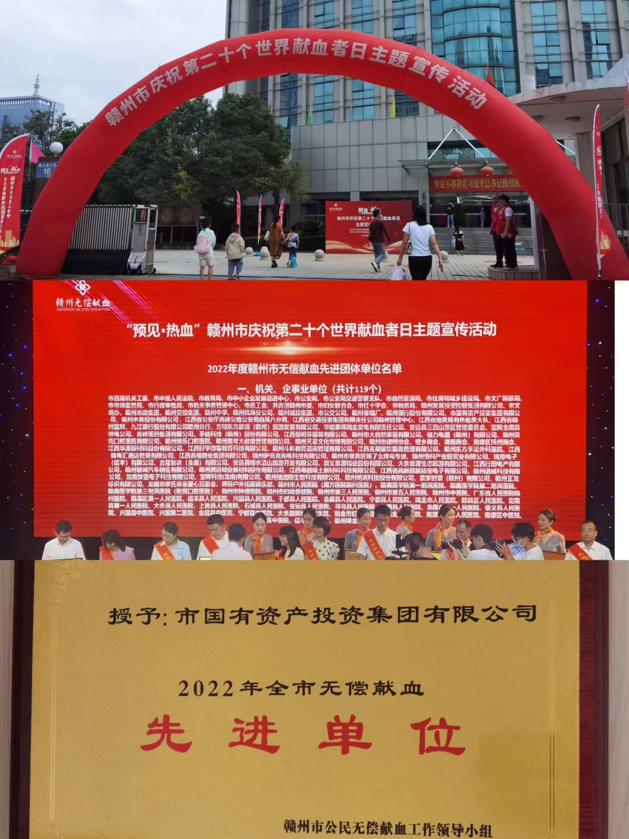 6月10日,赣州市“庆祝第二十个世界献血者日”主题宣传活动在赣州举行,会上对先进集体和个人进行了表彰,赣州市国投集团荣获“2022年全市无偿献血先进单位”称号。