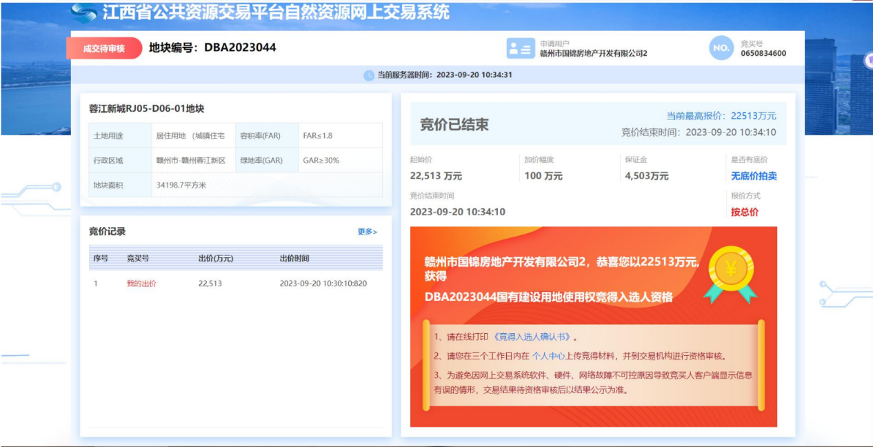 9月20日上午,赣州市国投集团下属国锦公司以成交总价48122万元竞得蓉江新城RJ05-D04-01、RJ05-D06-01地块。