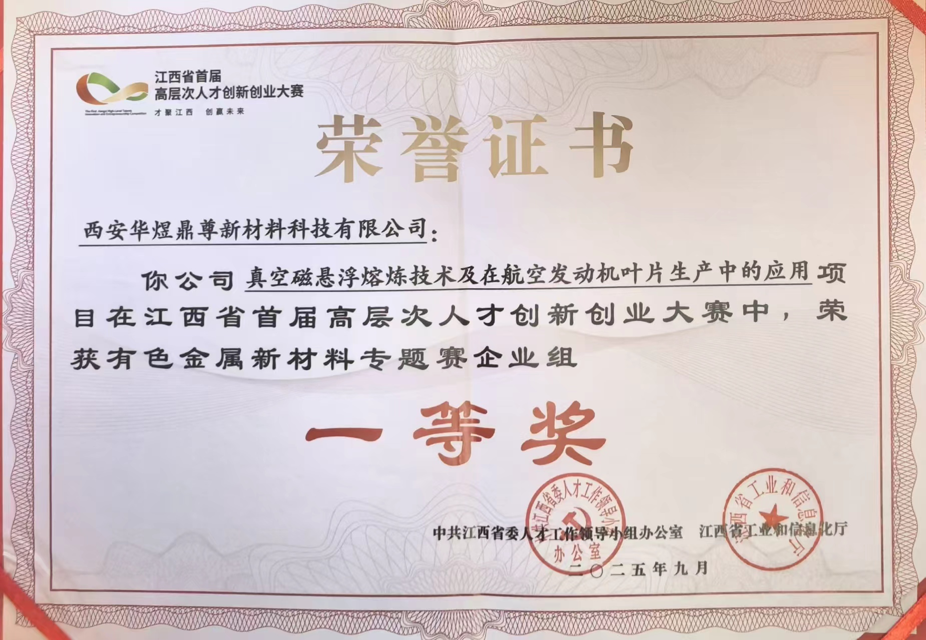 近日,由江西省委人才办、江西省工业和信息化厅主办的江西省首届高层次人才创新创业大赛决赛在南昌圆满落幕,由赣州国投集团推荐参赛的西安华煜鼎尊新材料科技有限公司“真空磁悬浮熔炼技术及在航空发动机叶片生产中的应用”项目,荣获有色金属新材料专题赛企业组一等奖,并位列第十届“创客中国”中小企业创新创业大赛有色金属新材料专题赛全国第一名。