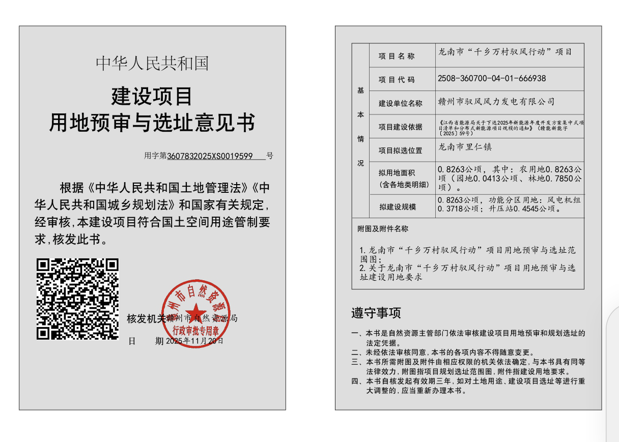 11月20日,赣州国投集团下属新能源公司龙南市“千乡万村驭风行动”项目取得重大进展——获赣州市自然资源局核发的《建设项目用地预审与选址意见书》,正式取得用地预审批复。此举为项目后续核准手续的高效办理奠定了坚实基础,标志着项目的落地推进取得关键突破。